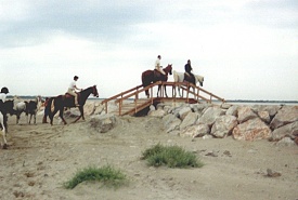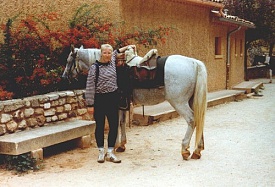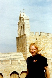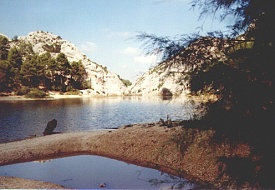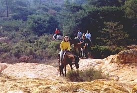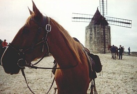 On Monday, 17th September 1990 my friend Corinna and I took a night train to Arles in the south of France. From there we went to Saint-Maries-de-la Mer, a place of pilgrimage for the gypsies at the coast of the Camarque region. The Camarque is famous for its black bulls and white horses. We stayed at the youth hostel in Pioch Badet for a week and visited the area (the church, the beach, the Parc Ornithologique du Pont de Gau). On Saturday, 22nd September we went to Arles and walked around this beautiful Roman city. In the evening we got picked up at Arles station by Yves, owner of the riding centre "Ferme Equestre de Bressieux" of St. Romain de Lerps. With the other tour participants we spent the night in a dormitory at a typical "mas" near Saint-Maries. The group consisted of seven French people and seven Americans. The following day we started on our trail ride. We were allocated our horses and crossed the river by ferry. Then we spent the day riding along the beach before we returned to our accommodation. On 24th September we made our way through the Camarque until we reached the vicinity of Arles where we spent the night at another "mas". The following morning we rode through the city, which was pretty exciting with the traffic and all. Then we entered the Provence region and in the afternoon we reached Fontvieille with its windmill. We spent the night at a hotel in Fontvieille, sharing a room between three. The day afterwards we passed by the famous Les-Baux-de-Provence, nestling on a hill, and St. Remy-de-Provence. For the night we stayed at an old stable in Eygalières. On Thursday the 27th we followed the mountain range Chaîne des Alpilles. Finally we reached a riding center with adjoining camp ground at Mallemort, where (instead of the promised castle) we slept out in the open in our sleeping bags with nothing but a roof over our heads. That night it got pretty cold. The following day we crossed the Lubéron, passed by Bonnieux, and finished the day at an "auberge". On Saturday morning the 29th we rode to Roussillon which is famous for its ocre-coloured landscape ("pays des ocres"). Then we had to bid everyone farewell and that afternoon we were driven to Avignon where Corinna and I took the night train back to Düsseldorf. We rode for seven days between 3 and 5 1/2 hours per day. Dinner always consisted of a 3-course meal at a restaurant. For lunch we had a picnic. We had sunshine every day.