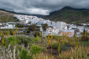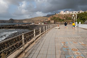 Heute ist Hotelwechsel angesagt. Nach dem Frühstück packen wir unsere Sachen und checken aus. Gegen 10 Uhr fahren wir los. Das Wetter ist heute sehr diesig mit schlechter Fernsicht. Wir fahren nach Maspalomas und laufen auf der Promenade entlang zum Aussichtspunkt über die Dünenlandschaft vor den Bettenburgen. Danach fahren wir nach Puerto de Mogán und laufen duch das nette Städtchen. Auch hier ist recht viel los. Wir setzen uns für ein Getränk auf die Aussichtsterrasse des Restaurants El Faro de Mogán an der Hafeneinfahrt. Gegen 13.30 Uhr fahren wir weiter. Wir halten kurz an der restaurierten Windmühle bei Mogán und dann an den bunten Felsen Los Azulejos. Schließlich erreichen wir Playa de la Aldea bei Aldea de San Nicolás. Dort trinken wir einen Kaffee zu einem Stück Kuchen. Danach geht es noch hoch zum Aussichtspunkt Mirador de Balcón mit spektakulärem Blick über die steil zum Meer abfallenden Felswände. Die schmale Küstenstraße in den Klippen wurde durch eine breit ausgebaute Tunnelstrecke ersetzt, die aktuell noch weiter verlängert wird. Um 16.15 Uhr erreichen wir das Hotel Occidental Roca Negra über dem Ort Agaete an der Nordostküste. Auch dieses Hotel ist nur für Erwachsene. Über booking.com haben wir 6 Nächte für 1.017,90 Euro mit Halbpension gebucht. Auch hier bekommen wir über Amazon Prime nachträglich 10% als Guthaben ins Wallet. Wir haben ein Zimmer im oberen Stock mit Meerblick einschließlich Blick über den Poolbereich. Nach dem Check-in laufen wir einen steilen Fußweg zu einigen Meerwasserpools hinunter und dann die Uferpromenade entlang bis ins Fischerdorf Puerto de las Nieves. In den Bergen hängen dunkle Wolken, doch hier unten scheint die Sonne bei etwa 20 °C, doch es weht ein kühler Wind.