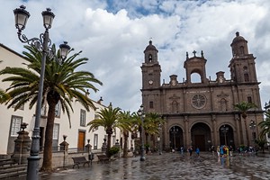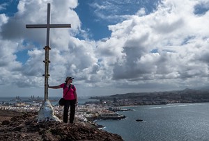 Heute Vormittag regnet es. Gegen 10 Uhr fahren wir nach Las Palmas, nach gut 35 Minuten parken wir unweit der Kathedrale Santa Ana. Als wir dort sind, kommt die Sonne raus! Wir laufen durch die Altstadt bis zur Ermita San Telmo und wieder zurück. Während eines Regenschauers kehren wir auf ein paar Churros mit heißer Schokolade ein. Nach gut zwei Stunden in der Stadt zahlen wir 4,65 Euro am Parkplatz und fahren weiter Richtung Isleta am Ende der Landzunge. Wir parken in einer Straße in der Nähe des Strandes Confital und starten gegen 13.30 Uhr eine Wanderung auf der Halbinsel, erst am Strand entlang und dann hoch zum Aussichtspunkt Mirador de la Cruz. Von dort oben haben wir einen tollen Blick auf Las Palmas zu unseren Füßen. Immer noch scheint hier die Sonne, während die Inselberge in den Wolken liegen.