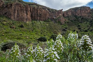 Heute scheint das Wetter besser als gestern. Um 9.30 Uhr machen wir uns noch einmal auf den Weg zum Pico de las Nieves. Diesmal fahren wir wieder die direkte Route in die Berge über St. Bartolomé. Mit einer kurzen Toilettenpause in Fataga brauchen wir diesmal fast 1,5 Stunden. Aber oben auf dem noch wolkenfreien Gipfel können wir nun den Rundumblick über die Insel genießen. Sehr gut kann man den Roque Nublo erkennen. Für den Blick bis zum Teide auf Teneriffa fehlt es leider an Fernsicht. Und kaum haben wir den Berg wieder verlassen, drücken die Wolken wieder rein. Wie am Vortag fahren wir am Cruz de Tejeda vorbei und parken dann am Pass Degollada de las Palomas in Richtung Artenara. Von dort läuft man 30 Minuten über einen Höhenweg mit spektakulärer Aussicht in die Caldera von Tejeda oder alternativ auf einem breiten Forstweg bis zu den Cuevas de Caballero, den „Höhlen des Herrn“, einem prähispanischen Kultplatz in der Steilwand. Nach etwa 1,5 Stunden, 4,4 Kilometern mit 190 Höhenmetern sind wir wieder am Parkplatz.