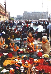 For Thursday we had arranged to meet Volker's penpal Marcela and her husband Roberto, who live in Mexico City. They picked us up at the hotel at 8.30 a.m. and we left for the pyramids of Teotihuacán by car. The 50km were approximately a one-hour drive,. The entry fee was 30 pesos. Built by the Toltecs, Teotihuacán was the capital of Mexico's first great civilization and probably had 200,000 inhabitants at its peak in the 6th century. It was a city the size of ancient Athens and Rome. It thrived as the primary center of learning and culture in America for over one thousand years, before it was abandoned about fifteen-hundred years ago, nobody knows why. We walked the Avenue of the Dead and climbed both the impressive, 70m high Pyramid of the Sun and the not much smaller Pyramid of the Moon. We had lunch at one of the tourist eateries surrounding the archeological site. Then we returned to Mexico City and visited the Zócalo, the Cathedral and the Templo Mayor. The historic center of Mexico City is the Plaza de la Constitución, more commonly known as the Zócalo, the world's largest square. The Zócalo and the Catedral Metropolitana were built with stones from the ruins of the temples and palaces of the Aztec city of Tenochtitlán. The Spanish crown, led by Hernan Cortés, conquered the Aztec Empire in 1521. Tenochtitlán was built on a one-square-mile island in the middle of an enormous shallow lake, so many of Mexico City's older buildings and churches are sinking into the boggy ground on which they were constructed. The cathedral is probably the largest on the American continent, but it has been badly damaged by earthquakes. To prevent further damage its interior is iron-clad. Just east of the cathedral are the remnants of the Templo Mayor, the Aztecs' principal temple, and the museum that houses the artifacts discovered at the site, which we also visited (35 pesos). We got a good view of the Zócalo from the roof-top terrace of the Hotel Majestic. The usually empty square was crowded with people celebrating the Day of the Dead (Día de los Muertos). There were many altars decorated for the dead who were said to visit that day. Indians were dancing and there were two stages for concerts. It was really a spectacle. For dinner we went to the American chain restaurant Tony Roma's in the World Trade Center of Mexico City.