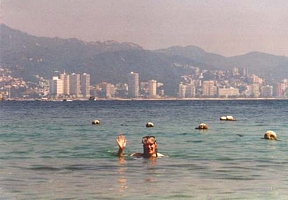 We had made reservations for the bus to Acapulco (120 pesos) at 9.10 a.m., so we had to get up early on Monday and take a taxi back to the bus station. The bus, however, had some technical problems and we already feared we were stranded. But eventually we were able to leave only half an hour later, expecting the bus to break down again any minute. For the first part of the trip we followed the course of a valley with a fantastic organ-pipe cacti scenery. After a short stop at Chilpancingo we rejoined the motorway and we arrived in Acapulco after a 4-hours drive without further problems. We took a taxi (35 pesos after some bargaining) to our Hotel Boca Chica (585 pesos/65 US$ including breakfast). The hotel is beautifully situated right across the Isla Roqueta and all the rooms have a seaview. But the area around it wasn't so good and the hotel itself, especially the room furniture, was quite shabby. The hotel has a pool and right next to it is a beach frequented by locals. In Acapulco it wasn't easy to escape the street merchants. It was very hot and very humid, quite unbearable really, and we were already late in the fall! We didn't do much the afternoon we arrived. We went swimming in the pool, took a bus to the Zócalo and walked up to La Quebrada where the clavadistas, the famous cliff divers, throw themselves from the seemingly suicidal height of 45m into a narrow crevasse. Not surprisingly, the divers pray at a small shrine before flinging themselves into the void. To be on the safe side food-wise we had dinner at Sanborns and we returned to the hotel by bus. The practical and cheap local busses, which run along the Avenida Miguel Alemán, also called Costera, the heart of Acapulco's resort strip and home to nearly all of Acapulco's resort hotels, non-stop nightlife, dining, and shopping, let you hop on and off any time for only 3.50 pesos. The Costera continues north along the bay toward Old Acapulco and the aging downtown area. The port of Acapulco has played a prominent role in world history. In fact Acapulco was a cornerstone of world trade as far back as the 16th century. Today the historic San Diego Fort overlooks the cruise ships and their terminal.