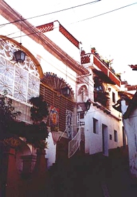 The next morning the group split up. As arranged the day before, a taxi arrived at the hotel at 9 a.m. to take us to the Terminal de Autobuses Sur (TAS) bus station in Mexico City. We shared the 350 pesos with Myriam and Christian who accompanied us. This time we needed only one hour to get back to Mexico City. While Myriam and Christian took a direct bus to Acapulco, Volker and I caught a (first class) bus (Estrella de Oro) to Taxco (78 pesos each) at 10.40 a.m. Even without a reservation it was no problem to obtain tickets. At 1 p.m. we arrived at our destination and for 15 pesos a VW beetle taxi took us to the Hotel Agua Escondida (500 pesos/53 US$), which we had booked in advance. This was the best hotel we stayed at during our entire trip. It was located right at the Zócalo, the rooms were friendly and clean and from the hotel pool we had a great view over the city and the Santa Prisca church. The old silver-mining town Taxco, 180km southwest of Mexico City, is probably one of the most picturesque places in Mexico, with its narrow, winding cobbled streets and colonial style buildings. The entire town has been declared a national historic monument. It is the silver capital of Mexico and jewelry and handicrafts can be bought on every corner. The Santa Prisca church is perhaps the finest example of baroque architecture in all of Mexico. Upon arrival we first visited the town center, then we took a swim and relaxed at the pool, just in time before the sun went down around 6 p.m. We had dinner on the balcony of a restaurant with a view over the Zócalo. From there we were able to observe Taxco's busy night life and the Volkswagen bugs and VW vans serving as small buses going round and round the city square...