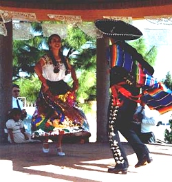 At 10 a.m. the next morning the bus picked us up at the hotel. There was no breakfast at the hotel, and it was hard to find anything open early on Saturday morning, so we ended up at Woolworth's where we had an American breakfast. The wedding started at 11 a.m.. The ceremony lasted one hour  and was held in Spanish and French. Those of our group who spoke none of these languages had to content themselves with watching. After church the bus took us to Metepec, just outside of Toluca, where the wedding party took place in a garden. There was a buffet lunch, then traditional dances were shown and the mariachis played their traditional music. It was I who caught the bouquet! For a souvenir all the foreign visitors received an Arból de Vida, a colorful "tree of life", made from clay and used as a candlestick. After sunset it grew fairly cold but the fiesta continued inside with music and dancing until about 9 p.m. As the bus was gone by then, some family members were so kind to give us a ride back to the hotel.