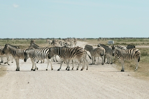 die Straße von einer riesigen Zebraherde blockiert. Auch Springböcke gab