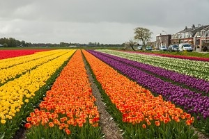 Am Karfreitag sind wir nach Südholland gefahren. Auf der Hinfahrt haben wir für die 250 Kilometer recht lange gebraucht, da stellenweise noch einiges an Stau war. Das Wetter war während der Fahrt recht schön mit viel Sonne. Doch gegen Mittag zog es sich zu mit ein paar Schauern. Gegen 14 Uhr waren wir erst am Ziel in Noordwijkerhout an der holländischen Küste. Von dort sind wir dann mit den Fahrrädern mehr oder weniger die Dünen- und Blütenstrecke (grob übersetzt für die Duin- en Bollenstreek) gefahren. D.h. unsere Route führte durchs Zentrum des netten Örtchens und dann an einigen Tulpenfeldern entlang, die herrlich blüten, am berühmten Keukenhof vorbei, den wir allerdings nicht besucht haben, dann noch an einem See entlang, wo wir uns in einem Café Appelgebak und Kaffee gönnten, und anschließend durch die Dünen mit einem Abstecher zum Strand wieder zurück. Nach insgesamt 23 Kilometern waren wir gegen 17 Uhr wieder am Auto. Mit dem Wetter hatten wir noch Glück. Nach einem anfänglichen Regenschauer kam bald wieder die Sonne raus, und als wir dann an den Blumenfeldern vorbeifuhren, leuchtete alles wunderbar. Erst als wir am Strand waren, drohten wieder dunkle Wolken, und für den Rest des Abends war es dann bewölkt. Insgesamt war es recht frisch, um die 13 °C.