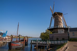 Wir fuhren nun noch etwa 30 Kilometer bis ins Campanile-Hotel bei Gouda, das wir für zwei Nächte gebucht hatten. Da wir nun keine Lust mehr hatten, mit dem Fahrrad noch die paar Kilometer bis ins Zentrum zu fahren, gingen wir abends im Hotelrestaurant essen. Wir nahmen das Tagesgericht für 13 Euro. Es gab Kip Lousiana (Hähnchen mit Baconstreifen) mit Pommes duchesse (Herzoginkartoffeln) und Salat. Das Hotel liegt direkt an der Autobahn, aber wenn die Türen und Fenster zu sind, hört man nichts mehr vom Verkehr. Wir hatten das Hotel gewählt, weil es mit 59 Euro pro Nacht (ohne Frühstück) recht günstig war, und weil man dort mit Fahrradgepäckträger am Auto gut parken konnte. Über Nacht konnten wir die Räder dann auch in einem Schuppen abstellen. Am Samstagvormittag war es leider trübe und kühl. Gegen 9 Uhr starteten wir am Hotel und fuhren erst mal zum Marktplatz von Gouda, wo wir in einem Café frühstückten. Dann fuhren wir mit dem Rad immer auf dem Damm der Ijssel entlang bis Ouderkerk und dann von Krimpen aus mit der Fähre (0,75 Euro pro Person mit Fahrrad) über den Lek nach Kinderdijk. Die 19 Polder-Windmühlen bei Kinderdijk wurden im 18. Jahrhundert erbaut, um das überschüssige Wasser aus den Poldern, die unter Meeresniveau liegen, in den nahen Fluss Lek zu pumpen, und gehören heute zum Unesco-Weltkulturerbe. Entlang der Windmühlen kann man sehr schön bis nach Ablasserdam radeln. Jetzt schien auch wieder die Sonne, und der Himmel war bald wolkenlos. Wir hatten nun um die 16 °C.