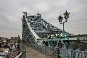 Stahlbrücke Blaues Wunder. Ein Dampfschiff macht gerade Station am