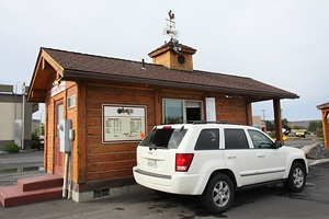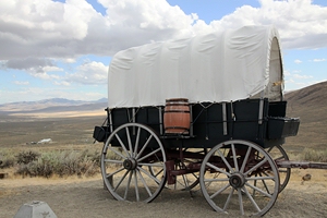 Wir fuhren danach noch ein Stück hinter Sumpter raus auf dem Elkhorn Scenic Byway bis zur ehemaligen Ghost Town Granite. Hier haben sich offenbar viele Leute inzwischen ein Wochenendhäuschen hingestellt, und bis auf die alte Kirche hat es sich für uns eigentlich nicht gelohnt. Kurz nach 11.30 Uhr machten wir uns auf die Weiterfahrt, zurück nach Sumpter und bis ins historische Baker City, das wir gegen 12.20 Uhr erreichten. Bei Safeway besorgten wir uns erst mal ein Sandwich zum Mittagessen, das wir an einem kleinen Park verspeisten. Sonne und Wolken wechselten sich immer wieder ab.  Wir liefen noch kurz durch die Main Street und machten uns gegen 14.20 Uhr auf zum Oregon Trail Interpretive Center einige Meilen abseits der Interstate 84 auf dem Flagstaff Hill. Der Eintritt war mit dem NP Pass abgedeckt. Im Gebäude gab es eine Ausstellung mit vielen Erinnerungsstücken aus der Zeit der Pioniere. Auf dem Außengelände gibt es einen Trail zu alten Wagenspuren, und einige Planwagen sind auf dem Hügel aufgestellt. Hier oben pfiff ein kalter Wind und in der Ferne drohten dunkle Wolken.