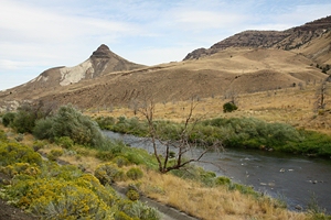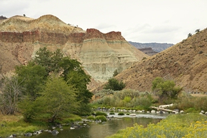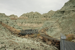 Wir fuhren nun also doch unsere Route wie geplant weiter und hofften einfach mal das Beste. Wir kauften noch kurz was fürs Mittagessen ein, und in Prineville hielten wir an einem Espresso Shack. Da die Sonne sich gerade versteckte, fuhren auch nicht noch einmal zu den Painted Hills, die wieder an der Strecke lagen, sondern steuerten direkt die Sheep Rock Unit des John Day Fossil Beds National Monuments an. Unterwegs kamen wir noch durch das historische Örtchen Mitchell. Hier gibt es ein paar Gebäude im Westernstil und ein altes Hotel. Um 11.30 Uhr erreichten wir unser Ziel. Auch hier war kein Eintritt zu zahlen. Mit unserer Ankunft verabschiedete sich auch die Sonne, die bis hierher noch ein wenig geschienen hatte, für den Rest des Tages. Leider kommen die Farben der Badlands ohne Sonne nicht so schön raus. Im Visitor Center schauten wir uns zunächst die Fossilienausstellung an. Dann fuhren wir zum Blue Basin und liefen den Island in Time Trail von 0,6 Meilen (one-way). Es gibt auch noch einen Blue Basin Overlook Trail von insgesamt 3 Meilen, der sicher einen interessanten Blick von oben geboten hätte, aber den haben wir in Anbetracht der Lichtverhältnisse ausgelassen. Als Nächstes ging es zum Cathedral Rock und kurz dahinter parkten wir an einer Picnic Area mit zwei kurzen Trails zu weiteren schönen Badlandsformationen, die wir noch gelaufen sind: der Story Through Time Trail und der Flood of Fire Trail. Anschließend ging es dieselbe Strecke zurück. Wir besuchten noch die historische Cant Ranch. Wir durften Äpfel pflücken, und der Ranger gab uns noch einen Hinweis, wo wir in der Picture Gorge am Highway 26 indianische Felszeichnungen sehen können. Die Sheep Rock Unit hat uns auch sehr gut gefallen. Hier kann man locker einen ganzen Tag verbringen.