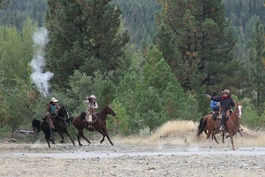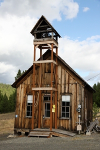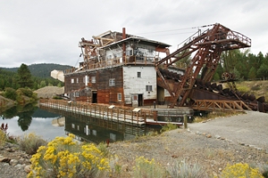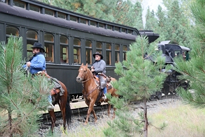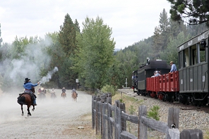 Zum Frühstück waren wir wieder im The Outpost. Wir nahmen Eier und Hashbrowns mit Toast für $12. Um 8.45 Uhr waren wir aufbruchsbereit. Wir fuhren ein kurzes Stück die Straße Richtung Süden, um uns das historische Canyon City anzuschauen. Abseits der Hauptstraße sind einige alte Gebäude erhalten geblieben, auf denen schöne Wandgemälde angebracht wurden. Dann fuhren wir zurück nach John Day und weiter auf dem Highway 26 nach Osten. Bald bogen wir auf den Highway 7 ab, immer noch der Journey Through Time Scenic Byway. Kurz hinter dem Abzweig liegen linkerhand ein paar wenige Häuser der Ghost Town Austin, einige Meilen weiter auf dem Highway 7 sieht man schon bald die noch stehenden Gebäude der Ghost Town Whitney in der Ebene liegen. Bald darauf kommt der Abzweig nach Sumpter. Als wir gerade hier abbiegen wollten, sahen wir eine Dampflokomotive kommen! Wir waren natürlich schneller als die Lok und trafen bereits vor ihr in dem netten Wildwestdorf Sumpter ein. Hier stehen einige sehenswerte Gebäude und die Historic Sumpter Valley Gold Dredge. Hinter dem Bahnhof machten sich schon die Cowboys bereit. Wir hielten auf dem großen Parkplatz vor dem Bagger und konnten uns gerade rechtzeitig für den Eisenbahnüberfall um 10.30 Uhr in Position stellen. Das ist der Vorteil, wenn man am Wochenende unterwegs ist. Da finden doch immer wieder mal interessante Vorführungen statt! Wir waren jedenfalls begeistert, zur richtigen Zeit am richtigen Ort zu sein. Abgesehen von den paar Touristen in der Bahn war hier auch gar nicht viel los.