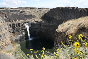 Ab Clarkston an der Grenze zu Idaho ging es auf den Highway 12 nach Westen. In Pomeroy genehmigten wir uns an einem Espresso Shack zwei große Milkshakes (sehr lecker). Die Landschaft hier besteht aus lieblichen Hügeln und Farmland. Wir passierten den Ort Starbuck (die Kaffeefirma stammt aber aus Seattle), und auf dem Highway 261 querten wir den Snake River. Kurz darauf erreichten wir kurz vor 12 Uhr den Palouse Falls State Park. Der Zutritt zu der sehr gepflegten Parkanlage oberhalb des schönen Wasserfalls war überraschenderweise kostenlos. Nur eine Spendenbox war aufgestellt. Die Tageszeit für Fotos war ungünstig. Die Sonne schien, und der Wasserfall lag noch halb im Schatten der Felswände. Übernachtungsplätze direkt in der Nähe sind aber offenbar rar. An den Picknicktischen auf einer grünen Wiese aßen wir zu Mittag.