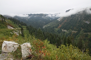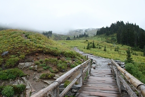 Nach weiteren 45 Minuten hatten wir den höchsten Punkt erreicht. Dann kam auch bald der Panorama Point auf 6800 Fuß. Und wir konnten uns überlegen, was wäre wenn… Denn bei guter Sicht soll man von hier den Mount St. Helens und den Mount Adams sehen können. Den Abstecher zur Glaciar Vista sparten wir uns. Nachdem es kurz aufgehört hatte, fing es wieder an zu regnen. Nun wollten wir auf dem schnellsten Weg zurück. Eine Stunde brauchten wir für den Weg nach unten. Auf dieser Seite lief man ziemlich steil abwärts. Nach insgesamt 3 Stunden und 15 Minuten waren wir wieder im Visitor Center, wobei wir uns unterwegs kaum aufgehalten hatten (außer notwendigen Verschnaufpausen beim Aufstieg), was bei schönem Wetter auf jeden Fall anders gewesen wäre. Bereut habe ich die Wanderung nicht. Es war trotz allem ein Erlebnis und vor allem der erste Teil war auch bei schlechtem Wetter sehr schön. Für den oberen Teil fehlte leider die Sicht auf den Mount Rainier und den Gletscher. Und falls jemand nicht die große Wanderung machen will, es gibt hier oben auch viele kürzere Trails.