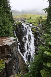 Also fuhren wir wie geplant über den Stevens Canyon Entrance in den Mount Rainier National Park. Hier galt natürlich der Interagency Pass. Ansonsten zahlt man $15 für ein 7-Tages-Permit. Die Strecke nach Paradise war auch wolkenverhangen reizvoll. Wir kamen an den Cougar Falls vorbei und hielten an den Reflection Lakes, aber leider gab es heute keine Spiegelung des Berges. Wir erhaschten noch einen Blick auf den Nisqually Gletscher im Nebel und fuhren dann in den Regen hinein. Um 9.40 Uhr waren wir in Paradise. Bei schönem Wetter ist es sicher paradiesisch hier. Wir wollten im Visitor Center nach Empfehlungen fragen, doch das öffnete erst um 10 Uhr. Also machten wir uns schon mal wanderfertig mit voller Regenausrüstung und stellten uns dann mit den anderen Wartenden vor die Eingangstür. Wir waren dann doch die ersten, die zur Information wollten. Und wider Erwarten wurde uns trotz des Wetters der Skyline Trail vorgeschlagen, den wir uns für heute eigentlich vorgenommen hatten.
