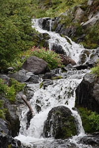 Der Skyline Loop mit dem High Skyline Trail ist unter Strenuous Trails aufgeführt: ein Rundweg von 5,5 Meilen mit 518 Metern Höhenunterschied, durchschnittliche Wanderzeit: 4,5 Stunden. Ob sich die Anstrengung überhaupt lohnt bei dem Wetter? Nun ja. Um 10.30 Uhr liefen wir los. Zunächst ging es zu den schönen Myrtle Falls. Bei gutem Wetter kann man hinter dem Wasserfall den Mount Rainier sehen. Der Regen hörte zwischenzeitlich zum Glück wieder auf. Und die Wanderung war wunderschön. Kleine Bäche, Wasserfälle, Blumenwiesen (die im Juli und August herrlich sein müssen). Hier möchte ich noch mal laufen, wenn sich der Mount Rainier zeigt! Nach 1,5 Stunden erreichten wir den Abzweig zum Golden Gate Trail. Hier hätten wir in einem Loop zurück zum Visitor Center abkürzen können. Und wir waren nahe dran. Aber dann kam ein Wanderer von oben, und wir fragten ihn, wie es dort war. Und er sagte, es hätte immer wieder Wolkenlücken gegeben. Da wir gerade eine solche Wolkenlücke erlebt hatten, hatten wir Hoffnung, also weiter! Wir waren schon auf Höhe der ersten Schneefelder. Es ging noch mal ganz schön hoch. Und die Sicht wurde immer schlechter, so dass wir es bald bereuten, weitergelaufen zu sein. Wir erreichten das Geröllfeld. Hier oben fegte der Wind. Wir fühlten uns wie Reinhold Messner bei der Besteigung des Mount Everest. Man sah nur noch wenige Meter weit. Schneeregen peitschte uns ins Gesicht, und es war nicht ganz ungefährlich auf den nassen Steinen.