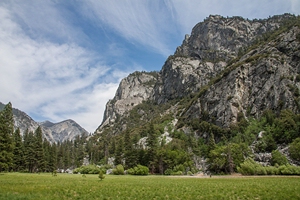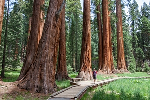 Rundweg um eine Wiese, die mit Mammutbäumen umgeben ist. Der Sequoia