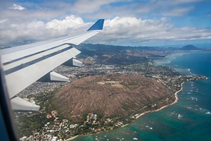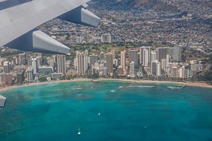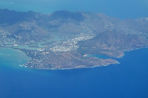 und Honolulu beim Landeanflug auf Oahu. Ankunft ist eine halbe Stunde