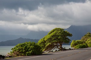 Küste ist es sonnig bei 28 °C, in den Bergen hängen Wolken. Über den Pali