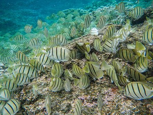 Fischschwärme. Das Wasser ist ganz klar. Wir wechseln uns ab beim