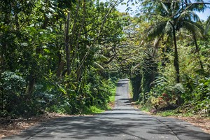 Straße weiter nach Kalapana. Man fährt zwischen Baumtunneln und Palmen am