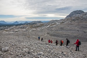 durch ein Geröllfeld absteigen, was aufgrund des losen Untergrunds