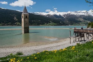 Italien/Südtirol und hielten für ein Foto am Kirchturm im Stausee.