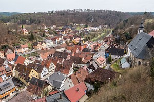 Forchheim Nach dem Frühstücksbüffet im Hotel laufen wir noch mal eine Runde durch die Altstadt von Bamberg. Dann fahren wir zum Wanderparkplatz auf die Ehrenbürg, auch Walberla, genannt in Kirchehrenbach in der Nähe von Forchheim. Um 10.15 Uhr laufen wir los. Nach einer halben Stunde haben wir die Nordkuppe, das 513,9 Meter hohe Walberla mit der Walburgis-Kapelle erreicht, und auch die Sonne kommt für kurze Zeit wieder raus. Es weht allerdings wieder ein sehr kalter Wind. Die Wanderung geht weiter auf die Südkuppe, den 531,7 Meter hohen Rodenstein, und in einem Bogen unterhalb des Berges zurück. Nach insgesamt zwei Stunden, 7 Kilometern und 240 Höhenmetern sind wir wieder am Parkplatz. Dort gegenüber kehren wir im Restaurant Walberla ein und essen Schäuferla und Putenbrust. Mit zwei Getränken zahlen wir 33 Euro. Anschließend schauen wir uns Forchheim an und Ebermannstadt. Wir trinken noch einen Kaffee und fahren zum Parkplatz an der Binghöhle bei Streitberg im Schauertal und laufen von dort zu einem Wasserfall mit Sinterterrassen und zu einem Aussichtspunkt an der Burgruine Streitberg. Dann fahren wir nach Muggendorf im Wiesenttal und beziehen um 16.30 Uhr die Ferienwohnung Balkonia in den Wald & Wiesent Appartments. Die Wohnung mit separater Küche und Schlafzimmer ist sehr schön mit einem riesigen Südwestbalkon.