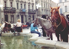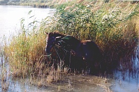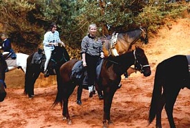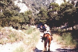 On Monday, 17th September 1990 my friend Corinna and I took a night train to Arles in the south of France. From there we went to Saint-Maries-de-la Mer, a place of pilgrimage for the gypsies at the coast of the Camarque region. The Camarque is famous for its black bulls and white horses. We stayed at the youth hostel in Pioch Badet for a week and visited the area (the church, the beach, the Parc Ornithologique du Pont de Gau). On Saturday, 22nd September we went to Arles and walked around this beautiful Roman city. In the evening we got picked up at Arles station by Yves, owner of the riding centre "Ferme Equestre de Bressieux" of St. Romain de Lerps. With the other tour participants we spent the night in a dormitory at a typical "mas" near Saint-Maries. The group consisted of seven French people and seven Americans. The following day we started on our trail ride. We were allocated our horses and crossed the river by ferry. Then we spent the day riding along the beach before we returned to our accommodation. On 24th September we made our way through the Camarque until we reached the vicinity of Arles where we spent the night at another "mas". The following morning we rode through the city, which was pretty exciting with the traffic and all. Then we entered the Provence region and in the afternoon we reached Fontvieille with its windmill. We spent the night at a hotel in Fontvieille, sharing a room between three. The day afterwards we passed by the famous Les-Baux-de-Provence, nestling on a hill, and St. Remy-de-Provence. For the night we stayed at an old stable in Eygalières. On Thursday the 27th we followed the mountain range Chaîne des Alpilles. Finally we reached a riding center with adjoining camp ground at Mallemort, where (instead of the promised castle) we slept out in the open in our sleeping bags with nothing but a roof over our heads. That night it got pretty cold. The following day we crossed the Lubéron, passed by Bonnieux, and finished the day at an "auberge". On Saturday morning the 29th we rode to Roussillon which is famous for its ocre-coloured landscape ("pays des ocres"). Then we had to bid everyone farewell and that afternoon we were driven to Avignon where Corinna and I took the night train back to Düsseldorf. We rode for seven days between 3 and 5 1/2 hours per day. Dinner always consisted of a 3-course meal at a restaurant. For lunch we had a picnic. We had sunshine every day.