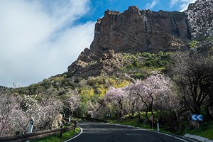 Heute fahren wir um 9 Uhr los. Es geht auf der gleichen Strecke wie gestern in die Berge, aber noch höher hinaus. Bei Ayacata biegen wir ab zum Roque Nublo. Auf diesem Stück blühen jede Menge Mandelbäume! Um 10.15 Uhr parken wir am Parkplatz La Goleta. Hier oben haben wir 9 °C. In 30 Minuten laufen wir bis zum Roque Nublo, und wir erwischen zum Glück auch eine Wolkenlücke am „Wolkenfels“ auf 1813 Metern Höhe. Insgesamt waren es 3,24 Kilometer mit 150 Höhenmetern.