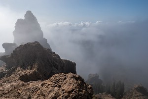 Heute sieht die Wettervorhersage gut aus, doch das täuscht. Um 9.30 Uhr machen wir uns auf den Weg zum zweithöchsten Punkt Gran Canarias, dem Pico de las Nieves auf 1949 Metern über dem Meeresspiegel. Bei Aguimes geht es auf einer schmalen Straße hoch in die Berge und schon bald sind wir in den Wolken, es sieht nicht gut aus für den Gipfel. Immerhin, kurz bevor wir nach einer Stunde Fahrt oben ankommen sind, lichten sich die Wolken. Der kleine Parkplatz ist schon fast voll, doch wir ergattern einen Platz und steigen das kurze Stück zum Aussichtspunkt hoch. Dort können wir einen Felsen und ein bisschen was von der Umgebung im Wolkennebel erkennen.
