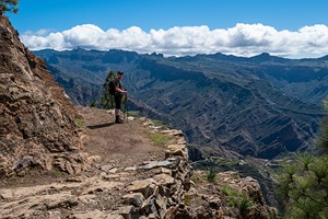 Das Frühstücksbüffet ab 7.30 Uhr ist auch sehr gut. Man kann sich u.a. Omeletts selbst zusammengestellt frisch zubereiten lassen. Es gibt warme und kalte Speisen. Danach packen wir unsere Wandersachen und fahren gegen 9.30 Uhr los. Bei Maspalomas geht es in vielen Kehren direkt in die Berge. Wir halten noch am Mirador Astronómico de la Degollada de las Yeguas mit spektakulärem Blick, und nach einer Stunde parken wir am Aussichtspunkt bei St. Bartolomé de Tirajana. Von dort starten wir unsere Wanderung, denn weiter oben hängen noch die Wolken in den Bergen. Vom Mirador Tunde laufen wir über den Sattel Degollada de Mananzilla zum Mirador Cruz Grande und auf einem alten Königsweg wieder bergab, insgesamt 13,8 Kilometer mit 410 Höhenmetern. Die Runde ist sehr schön mit tollen Ausblicken. Am Cruz Grande befinden wir uns auf 1250 Metern über dem Meeresspiegel. Uns kommen nur sehr wenige Wanderer und eine Gruppe Mountainbikefahrer entgegen. Nach 4,5 Stunden sind wir kurz vor 15 Uhr wieder am Parkplatz.