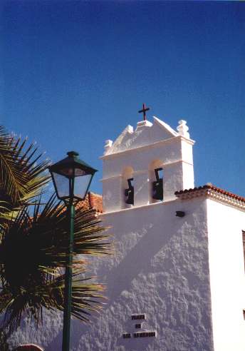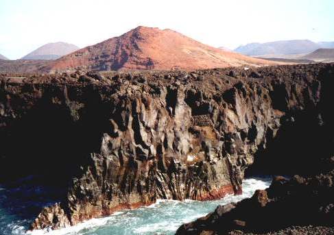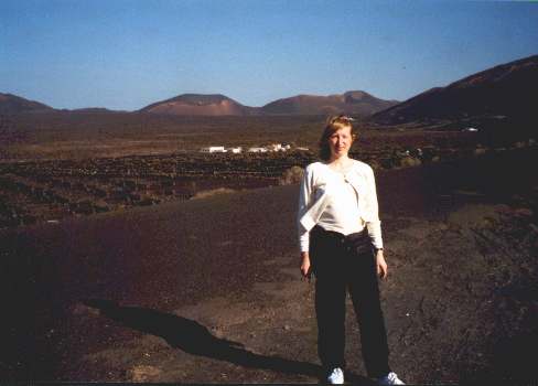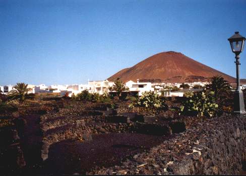 On the second day we went to the Playa de Janubio, a beautiful beach of black lava sand at Lanzarote's west coast. Then we explored the spectacular coastline of Los Hervideros where the surf rushes in and out of the openings and cracks formed by lava rock. El Golfo is a green lagoon inside an ancient volcanic crater, colouring caused by the algae that inhabit its waters. We stopped in Yaiza, one of the prettiest villages of Lanzarote, on our way to the Parque Nacional de Timanfaya, the most extensive volcanic region of Lanzarote with more than 100 volcanoes. The entry fee of 1000 Pesetas included a coach tour through the Montañas del Fuego or Fire Mountains. We had the opportunity to glance into several craters from the top. The restaurant El Diablo serves meals grilled over geothermal heat. Even near the surface the temperature rises to 400°C ! As a show for the tourists water is poured into some holes in the ground causing a geyser to erupt with a hissing noise. You can also ride a camel through this area but we didn't. We continued our tour passing through the villages of Mancha Blanca, Tinajo and Tiagua, the latter with a picturesque old windmill. We drove as far as La Caleta and the Playa de Famara, a surfing area, then returned to the hotel.