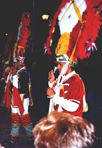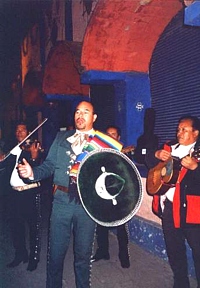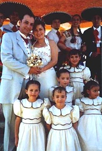 At 10 a.m. the next morning the bus picked us up at the hotel. There was no breakfast at the hotel, and it was hard to find anything open early on Saturday morning, so we ended up at Woolworth's where we had an American breakfast. The wedding started at 11 a.m.. The ceremony lasted one hour  and was held in Spanish and French. Those of our group who spoke none of these languages had to content themselves with watching. After church the bus took us to Metepec, just outside of Toluca, where the wedding party took place in a garden. There was a buffet lunch, then traditional dances were shown and the mariachis played their traditional music. It was I who caught the bouquet! For a souvenir all the foreign visitors received an Arból de Vida, a colorful "tree of life", made from clay and used as a candlestick. After sunset it grew fairly cold but the fiesta continued inside with music and dancing until about 9 p.m. As the bus was gone by then, some family members were so kind to give us a ride back to the hotel.