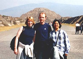 For Thursday we had arranged to meet Volker's penpal Marcela and her husband Roberto, who live in Mexico City. They picked us up at the hotel at 8.30 a.m. and we left for the pyramids of Teotihuacán by car. The 50km were approximately a one-hour drive,. The entry fee was 30 pesos. Built by the Toltecs, Teotihuacán was the capital of Mexico's first great civilization and probably had 200,000 inhabitants at its peak in the 6th century. It was a city the size of ancient Athens and Rome. It thrived as the primary center of learning and culture in America for over one thousand years, before it was abandoned about fifteen-hundred years ago, nobody knows why. We walked the Avenue of the Dead and climbed both the impressive, 70m high Pyramid of the Sun and the not much smaller Pyramid of the Moon. We had lunch at one of the tourist eateries surrounding the archeological site. Then we returned to Mexico City and visited the Zócalo, the Cathedral and the Templo Mayor. The historic center of Mexico City is the Plaza de la Constitución, more commonly known as the Zócalo, the world's largest square. The Zócalo and the Catedral Metropolitana were built with stones from the ruins of the temples and palaces of the Aztec city of Tenochtitlán. The Spanish crown, led by Hernan Cortés, conquered the Aztec Empire in 1521. Tenochtitlán was built on a one-square-mile island in the middle of an enormous shallow lake, so many of Mexico City's older buildings and churches are sinking into the boggy ground on which they were constructed. The cathedral is probably the largest on the American continent, but it has been badly damaged by earthquakes. To prevent further damage its interior is iron-clad. Just east of the cathedral are the remnants of the Templo Mayor, the Aztecs' principal temple, and the museum that houses the artifacts discovered at the site, which we also visited (35 pesos). We got a good view of the Zócalo from the roof-top terrace of the Hotel Majestic. The usually empty square was crowded with people celebrating the Day of the Dead (Día de los Muertos). There were many altars decorated for the dead who were said to visit that day. Indians were dancing and there were two stages for concerts. It was really a spectacle. For dinner we went to the American chain restaurant Tony Roma's in the World Trade Center of Mexico City.