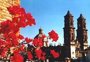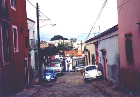 The next morning the group split up. As arranged the day before, a taxi arrived at the hotel at 9 a.m. to take us to the Terminal de Autobuses Sur (TAS) bus station in Mexico City. We shared the 350 pesos with Myriam and Christian who accompanied us. This time we needed only one hour to get back to Mexico City. While Myriam and Christian took a direct bus to Acapulco, Volker and I caught a (first class) bus (Estrella de Oro) to Taxco (78 pesos each) at 10.40 a.m. Even without a reservation it was no problem to obtain tickets. At 1 p.m. we arrived at our destination and for 15 pesos a VW beetle taxi took us to the Hotel Agua Escondida (500 pesos/53 US$), which we had booked in advance. This was the best hotel we stayed at during our entire trip. It was located right at the Zócalo, the rooms were friendly and clean and from the hotel pool we had a great view over the city and the Santa Prisca church. The old silver-mining town Taxco, 180km southwest of Mexico City, is probably one of the most picturesque places in Mexico, with its narrow, winding cobbled streets and colonial style buildings. The entire town has been declared a national historic monument. It is the silver capital of Mexico and jewelry and handicrafts can be bought on every corner. The Santa Prisca church is perhaps the finest example of baroque architecture in all of Mexico. Upon arrival we first visited the town center, then we took a swim and relaxed at the pool, just in time before the sun went down around 6 p.m. We had dinner on the balcony of a restaurant with a view over the Zócalo. From there we were able to observe Taxco's busy night life and the Volkswagen bugs and VW vans serving as small buses going round and round the city square...