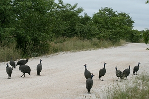 Perlhühner und Gnus. Eine schwarze Manguste lief uns noch über den Weg.