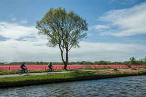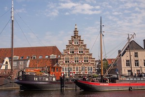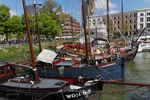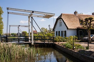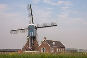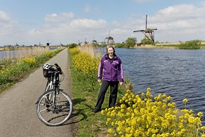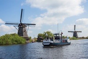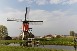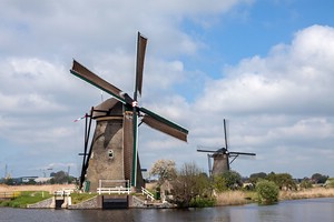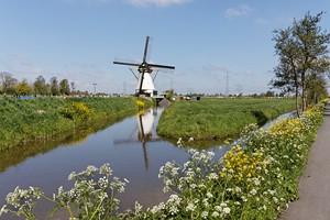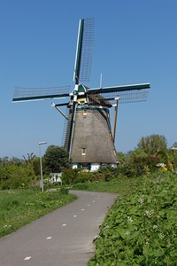 Wir fuhren nun noch etwa 30 Kilometer bis ins Campanile-Hotel bei Gouda, das wir für zwei Nächte gebucht hatten. Da wir nun keine Lust mehr hatten, mit dem Fahrrad noch die paar Kilometer bis ins Zentrum zu fahren, gingen wir abends im Hotelrestaurant essen. Wir nahmen das Tagesgericht für 13 Euro. Es gab Kip Lousiana (Hähnchen mit Baconstreifen) mit Pommes duchesse (Herzoginkartoffeln) und Salat. Das Hotel liegt direkt an der Autobahn, aber wenn die Türen und Fenster zu sind, hört man nichts mehr vom Verkehr. Wir hatten das Hotel gewählt, weil es mit 59 Euro pro Nacht (ohne Frühstück) recht günstig war, und weil man dort mit Fahrradgepäckträger am Auto gut parken konnte. Über Nacht konnten wir die Räder dann auch in einem Schuppen abstellen. Am Samstagvormittag war es leider trübe und kühl. Gegen 9 Uhr starteten wir am Hotel und fuhren erst mal zum Marktplatz von Gouda, wo wir in einem Café frühstückten. Dann fuhren wir mit dem Rad immer auf dem Damm der Ijssel entlang bis Ouderkerk und dann von Krimpen aus mit der Fähre (0,75 Euro pro Person mit Fahrrad) über den Lek nach Kinderdijk. Die 19 Polder-Windmühlen bei Kinderdijk wurden im 18. Jahrhundert erbaut, um das überschüssige Wasser aus den Poldern, die unter Meeresniveau liegen, in den nahen Fluss Lek zu pumpen, und gehören heute zum Unesco-Weltkulturerbe. Entlang der Windmühlen kann man sehr schön bis nach Ablasserdam radeln. Jetzt schien auch wieder die Sonne, und der Himmel war bald wolkenlos. Wir hatten nun um die 16 °C.