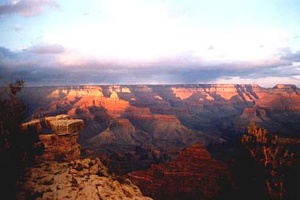 The first day of our round trip was to take us to the Grand Canyon. We passed over the Hoover Dam which was impressive and took the main road along the Interstate via Kingman and Williams. We arrived at the canyon in the evening just before sunset and drove past our motel (Best Western "Grand Canyon Squire Inn") to catch a last glimpse of the canyon before darkness. We saw it for a brief but beautiful moment in the red evening glow and it was really impressive. Some patches of snow could be seen on the steep banks. We took a few pictures, then drove back to check into the motel. We usually stayed at Best Western during this trip which is a good middle class chain of motels. The advantage was that this way it was easy to pre-book the motel for the following night before checking out. The first thing my cousin and I had to do after checking in was to find the ice-machine to cool our drinks, and my uncle's beer!