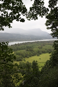Regen, der die Berge hinaufzieht. Wir stellen uns unter die Bäume und