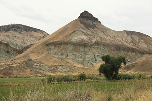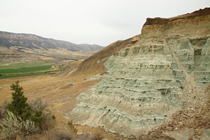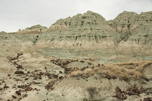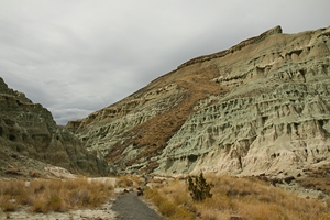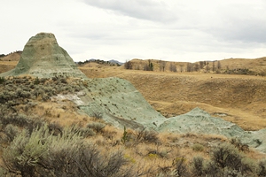 Wir fuhren nun also doch unsere Route wie geplant weiter und hofften einfach mal das Beste. Wir kauften noch kurz was fürs Mittagessen ein, und in Prineville hielten wir an einem Espresso Shack. Da die Sonne sich gerade versteckte, fuhren auch nicht noch einmal zu den Painted Hills, die wieder an der Strecke lagen, sondern steuerten direkt die Sheep Rock Unit des John Day Fossil Beds National Monuments an. Unterwegs kamen wir noch durch das historische Örtchen Mitchell. Hier gibt es ein paar Gebäude im Westernstil und ein altes Hotel. Um 11.30 Uhr erreichten wir unser Ziel. Auch hier war kein Eintritt zu zahlen. Mit unserer Ankunft verabschiedete sich auch die Sonne, die bis hierher noch ein wenig geschienen hatte, für den Rest des Tages. Leider kommen die Farben der Badlands ohne Sonne nicht so schön raus. Im Visitor Center schauten wir uns zunächst die Fossilienausstellung an. Dann fuhren wir zum Blue Basin und liefen den Island in Time Trail von 0,6 Meilen (one-way). Es gibt auch noch einen Blue Basin Overlook Trail von insgesamt 3 Meilen, der sicher einen interessanten Blick von oben geboten hätte, aber den haben wir in Anbetracht der Lichtverhältnisse ausgelassen. Als Nächstes ging es zum Cathedral Rock und kurz dahinter parkten wir an einer Picnic Area mit zwei kurzen Trails zu weiteren schönen Badlandsformationen, die wir noch gelaufen sind: der Story Through Time Trail und der Flood of Fire Trail. Anschließend ging es dieselbe Strecke zurück. Wir besuchten noch die historische Cant Ranch. Wir durften Äpfel pflücken, und der Ranger gab uns noch einen Hinweis, wo wir in der Picture Gorge am Highway 26 indianische Felszeichnungen sehen können. Die Sheep Rock Unit hat uns auch sehr gut gefallen. Hier kann man locker einen ganzen Tag verbringen.