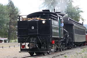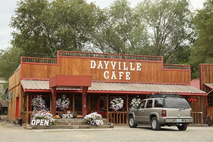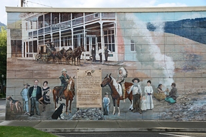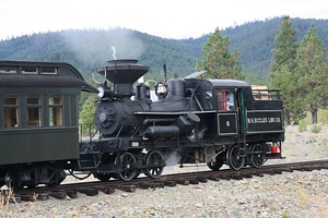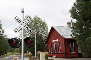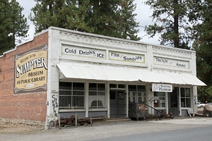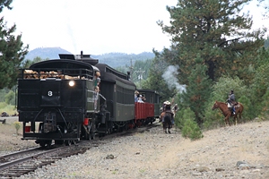 Zum Frühstück waren wir wieder im The Outpost. Wir nahmen Eier und Hashbrowns mit Toast für $12. Um 8.45 Uhr waren wir aufbruchsbereit. Wir fuhren ein kurzes Stück die Straße Richtung Süden, um uns das historische Canyon City anzuschauen. Abseits der Hauptstraße sind einige alte Gebäude erhalten geblieben, auf denen schöne Wandgemälde angebracht wurden. Dann fuhren wir zurück nach John Day und weiter auf dem Highway 26 nach Osten. Bald bogen wir auf den Highway 7 ab, immer noch der Journey Through Time Scenic Byway. Kurz hinter dem Abzweig liegen linkerhand ein paar wenige Häuser der Ghost Town Austin, einige Meilen weiter auf dem Highway 7 sieht man schon bald die noch stehenden Gebäude der Ghost Town Whitney in der Ebene liegen. Bald darauf kommt der Abzweig nach Sumpter. Als wir gerade hier abbiegen wollten, sahen wir eine Dampflokomotive kommen! Wir waren natürlich schneller als die Lok und trafen bereits vor ihr in dem netten Wildwestdorf Sumpter ein. Hier stehen einige sehenswerte Gebäude und die Historic Sumpter Valley Gold Dredge. Hinter dem Bahnhof machten sich schon die Cowboys bereit. Wir hielten auf dem großen Parkplatz vor dem Bagger und konnten uns gerade rechtzeitig für den Eisenbahnüberfall um 10.30 Uhr in Position stellen. Das ist der Vorteil, wenn man am Wochenende unterwegs ist. Da finden doch immer wieder mal interessante Vorführungen statt! Wir waren jedenfalls begeistert, zur richtigen Zeit am richtigen Ort zu sein. Abgesehen von den paar Touristen in der Bahn war hier auch gar nicht viel los.