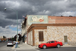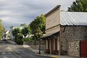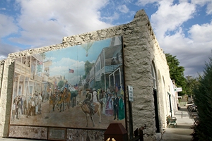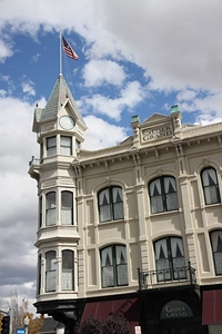 Wir fuhren danach noch ein Stück hinter Sumpter raus auf dem Elkhorn Scenic Byway bis zur ehemaligen Ghost Town Granite. Hier haben sich offenbar viele Leute inzwischen ein Wochenendhäuschen hingestellt, und bis auf die alte Kirche hat es sich für uns eigentlich nicht gelohnt. Kurz nach 11.30 Uhr machten wir uns auf die Weiterfahrt, zurück nach Sumpter und bis ins historische Baker City, das wir gegen 12.20 Uhr erreichten. Bei Safeway besorgten wir uns erst mal ein Sandwich zum Mittagessen, das wir an einem kleinen Park verspeisten. Sonne und Wolken wechselten sich immer wieder ab.  Wir liefen noch kurz durch die Main Street und machten uns gegen 14.20 Uhr auf zum Oregon Trail Interpretive Center einige Meilen abseits der Interstate 84 auf dem Flagstaff Hill. Der Eintritt war mit dem NP Pass abgedeckt. Im Gebäude gab es eine Ausstellung mit vielen Erinnerungsstücken aus der Zeit der Pioniere. Auf dem Außengelände gibt es einen Trail zu alten Wagenspuren, und einige Planwagen sind auf dem Hügel aufgestellt. Hier oben pfiff ein kalter Wind und in der Ferne drohten dunkle Wolken.