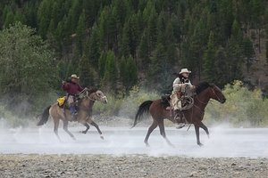 Da wir in den North Cascades und an der Küste wetterbedingt jeweils einen Tag eingespart hatten, blieb uns nun doch noch Zeit für einen Besuch des Hells Canyons. Der komplette Loop war leider auf Hälfte der Strecke gesperrt, weil durch einen Erdrutsch nach Überschwemmungen im Juni ein Teil der Straße weggebrochen war. Wir mussten uns also für die südliche oder die nördliche Zufahrt entscheiden. Der heutige Tag stand erst mal ganz im Zeichen des Wilden Westens: historische Goldgräberstädtchen, Ghost Towns, Planwagen und ein Eisenbahnüberfall…
