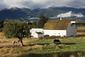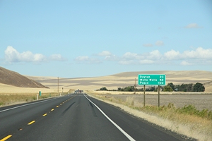 Auf der Weiterfahrt auf der I-84 nach Norden querten wir den 45. Breitengrad (der die halbe Strecke zwischen Nordpol und Äquator bezeichnet), und es regnete heftig. Aber wir saßen ja trocken im Auto und wollten jetzt nur Meilen machen. Einige Meilen nördlich von La Grande hätte mich noch das Oregon Trail Interpretive Center von Blue Mountain Crossing interessiert, wo die Wagenspuren besser erhalten sein sollen, aber wir bogen schon vorher auf den Highway 82, den Hells Canyon Oregon Scenic Byway, Richtung Wallowa Valley ab.