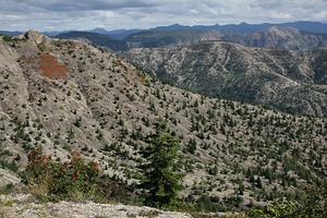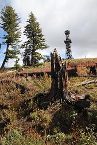 Um 11 Uhr hatten wir den Parkplatz am Hat Point erreicht. Hier gibt es einen kurzen Looptrail von einer halben Meile zum Fire Lookout auf 7000 Fuß. Von dort oben hat man einen weiten Blick auf die Umgebung.  Der Hat Point ist die einzige Stelle auf der Westseite des Hells Canyons, die ohne längere Wanderungen erreichbar ist und an der man den Snake River sehen kann. Mit bis zu 2436 Metern ist der Hells Canyon die tiefste Schlucht Nordamerikas, und er ist nicht nur tiefer, sondern auch breiter als der Grand Canyon, aber optisch weit weniger eindrucksvoll und fotogen. Leider hingen die Wallowa Mountains und die Seven Devils in den Wolken, aber wir waren schon froh, dass die Wolken so hoch hingen, dass wir überhaupt in den Canyon schauen konnten. Im Hochsommer muss es hier sehr schöne Wildblumenwiesen geben. Jetzt sah man nur noch die Reste davon. Auch Picknicktische gab es, aber leider war es hier oben bei nur 7 °C viel zu kalt, um es sich hier zum Lunch gemütlich zu machen.