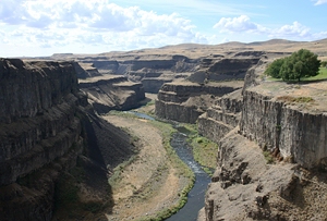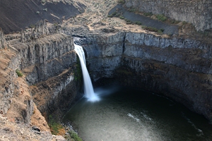 Ab Clarkston an der Grenze zu Idaho ging es auf den Highway 12 nach Westen. In Pomeroy genehmigten wir uns an einem Espresso Shack zwei große Milkshakes (sehr lecker). Die Landschaft hier besteht aus lieblichen Hügeln und Farmland. Wir passierten den Ort Starbuck (die Kaffeefirma stammt aber aus Seattle), und auf dem Highway 261 querten wir den Snake River. Kurz darauf erreichten wir kurz vor 12 Uhr den Palouse Falls State Park. Der Zutritt zu der sehr gepflegten Parkanlage oberhalb des schönen Wasserfalls war überraschenderweise kostenlos. Nur eine Spendenbox war aufgestellt. Die Tageszeit für Fotos war ungünstig. Die Sonne schien, und der Wasserfall lag noch halb im Schatten der Felswände. Übernachtungsplätze direkt in der Nähe sind aber offenbar rar. An den Picknicktischen auf einer grünen Wiese aßen wir zu Mittag.