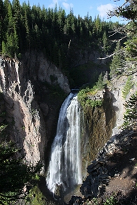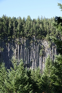 Zum Frühstück gab es Waffeln zum Selberbacken, Toast, Bagel, Cereals, Joghurt, usw. Um 8.15 Uhr fuhren wir los. Auf dem Highway 12 ging es am Tieton River und dem Rimrock Lake entlang, eine sehr schöne Strecke durch die Wälder. Wir hielten an den Clear Creek Falls, die aus zwei Wasserfällen bestehen. Insbesondere der untere ist viel schöner als wir erwartet hätten. Frisch ist es hier. Dann wird es bergiger, und als wir um eine Kurve biegen, liegt er auf einmal vor uns in aller Pracht – der schneebedeckte Mount Rainier! Trotz eines Wolkenbands war er wunderbar zu sehen. Ein toller Anblick. Wir halten noch am Palisades Viewpoint mit Blick auf eine Abbruchkante mit Basaltfelsen. Hier zeigen sich auch ein paar schöne Herbstfarben.