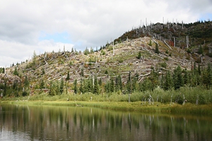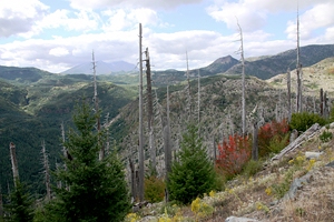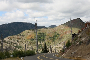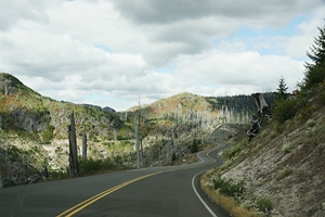 Wir fuhren noch mal nach Packwood rein, um uns in einem Coffee House einen Kaffee zu besorgen. Gegen 11 Uhr brachen wir dann auf zum Mount St. Helens. Wir nahmen den Highway 25 und 99. Es geht zunächst durch den Wald, vom Berg ist noch nichts zu sehen, aber schließlich kommen mehrere Viewpoints mit Blick auf den Vulkan, der durch seinen Ausbruch 1980 Berühmtheit erlangt hat, und den Spirit Lake. Hier gilt auch wieder unser NP Pass, oder man braucht einen National Forest Pass für $5. Einmal sehen wir noch den Mount Rainier in der Ferne halb in den Wolken. Der nahe Mount Adams versteckt sich. Beeindruckend sind die ganzen abgestorbenen und umgefallenen Bäume in der sogenannten Blast Zone. Auch auf dem Spirit Lake treiben noch viele weiße Baumstämme. Wir halten am Miner‘s Car und laufen den kurzen Trail zum Meta Lake. Hier ist eine tolle Vegetation.