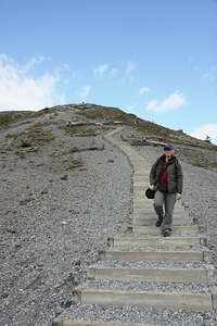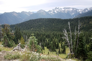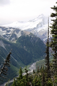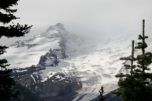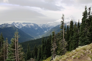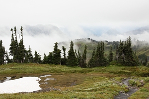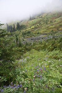 Nach weiteren 45 Minuten hatten wir den höchsten Punkt erreicht. Dann kam auch bald der Panorama Point auf 6800 Fuß. Und wir konnten uns überlegen, was wäre wenn… Denn bei guter Sicht soll man von hier den Mount St. Helens und den Mount Adams sehen können. Den Abstecher zur Glaciar Vista sparten wir uns. Nachdem es kurz aufgehört hatte, fing es wieder an zu regnen. Nun wollten wir auf dem schnellsten Weg zurück. Eine Stunde brauchten wir für den Weg nach unten. Auf dieser Seite lief man ziemlich steil abwärts. Nach insgesamt 3 Stunden und 15 Minuten waren wir wieder im Visitor Center, wobei wir uns unterwegs kaum aufgehalten hatten (außer notwendigen Verschnaufpausen beim Aufstieg), was bei schönem Wetter auf jeden Fall anders gewesen wäre. Bereut habe ich die Wanderung nicht. Es war trotz allem ein Erlebnis und vor allem der erste Teil war auch bei schlechtem Wetter sehr schön. Für den oberen Teil fehlte leider die Sicht auf den Mount Rainier und den Gletscher. Und falls jemand nicht die große Wanderung machen will, es gibt hier oben auch viele kürzere Trails.