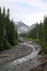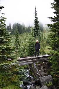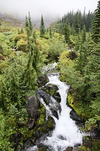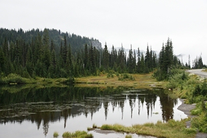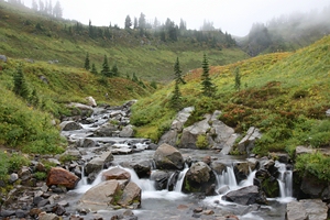 Also fuhren wir wie geplant über den Stevens Canyon Entrance in den Mount Rainier National Park. Hier galt natürlich der Interagency Pass. Ansonsten zahlt man $15 für ein 7-Tages-Permit. Die Strecke nach Paradise war auch wolkenverhangen reizvoll. Wir kamen an den Cougar Falls vorbei und hielten an den Reflection Lakes, aber leider gab es heute keine Spiegelung des Berges. Wir erhaschten noch einen Blick auf den Nisqually Gletscher im Nebel und fuhren dann in den Regen hinein. Um 9.40 Uhr waren wir in Paradise. Bei schönem Wetter ist es sicher paradiesisch hier. Wir wollten im Visitor Center nach Empfehlungen fragen, doch das öffnete erst um 10 Uhr. Also machten wir uns schon mal wanderfertig mit voller Regenausrüstung und stellten uns dann mit den anderen Wartenden vor die Eingangstür. Wir waren dann doch die ersten, die zur Information wollten. Und wider Erwarten wurde uns trotz des Wetters der Skyline Trail vorgeschlagen, den wir uns für heute eigentlich vorgenommen hatten.